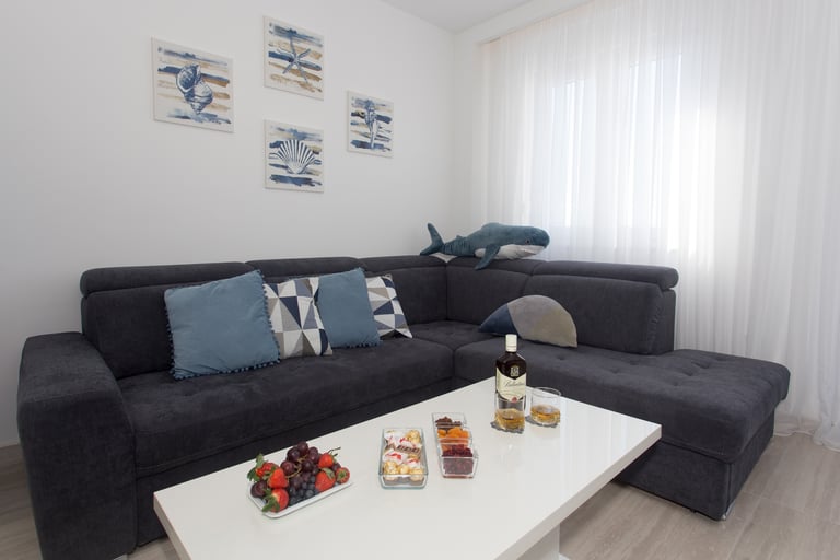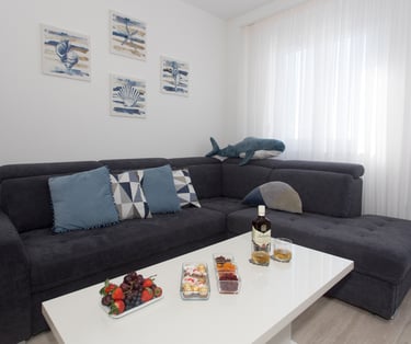 A bright, contemporary apartment with a spacious living area and plush seating, designed for effortless comfort and style. Unwind on the elegant sofa, enjoy unhurried dinners at the dining table, and retreat to a calm, refined space after a perfect day by the sea.