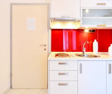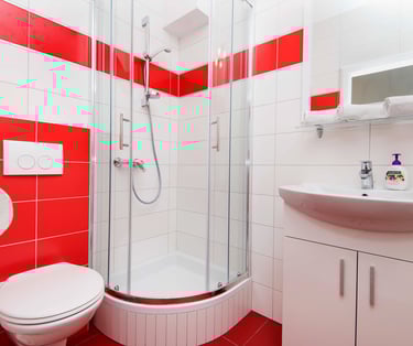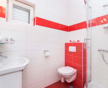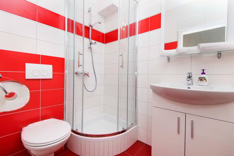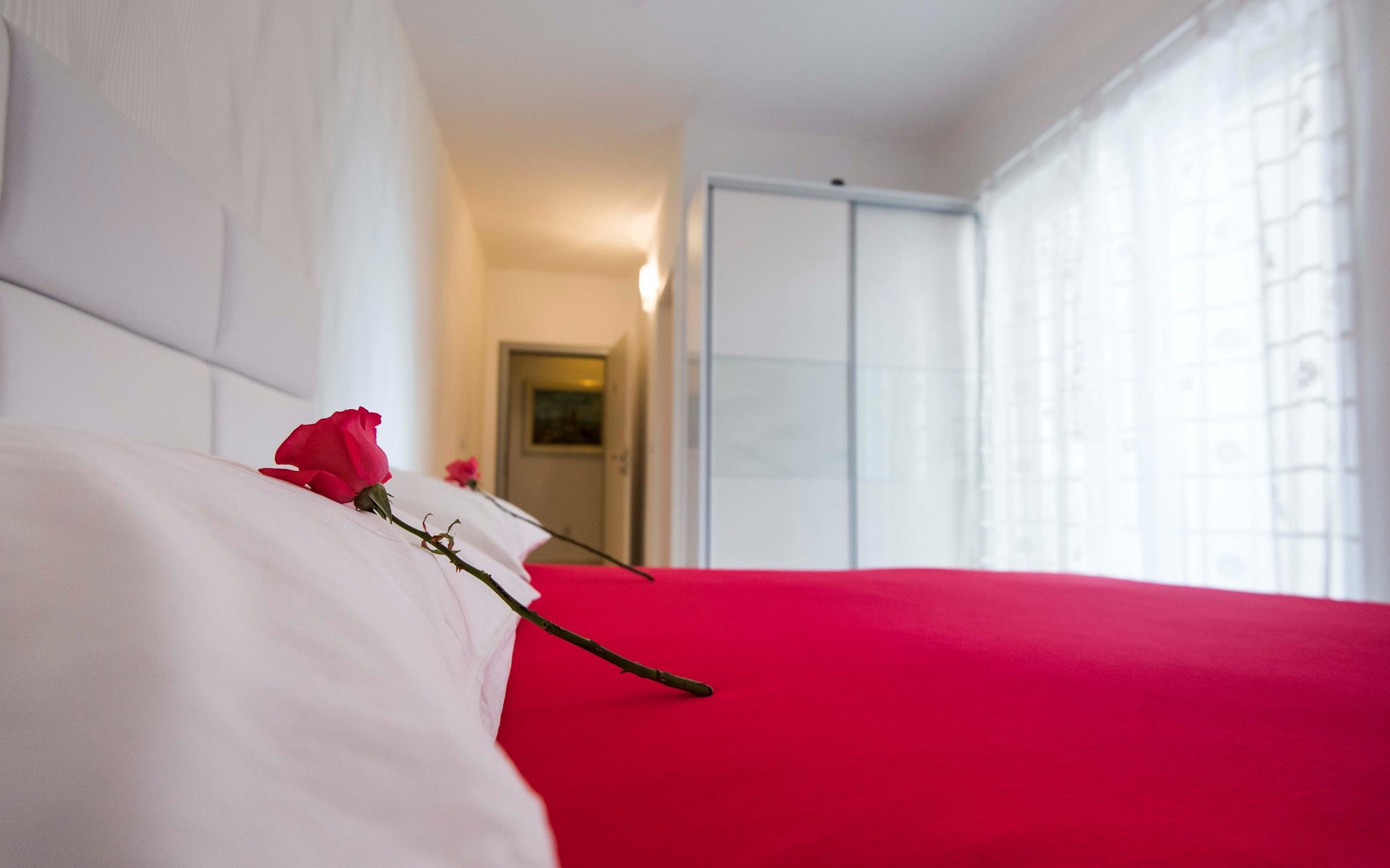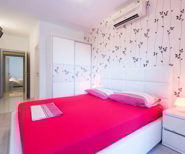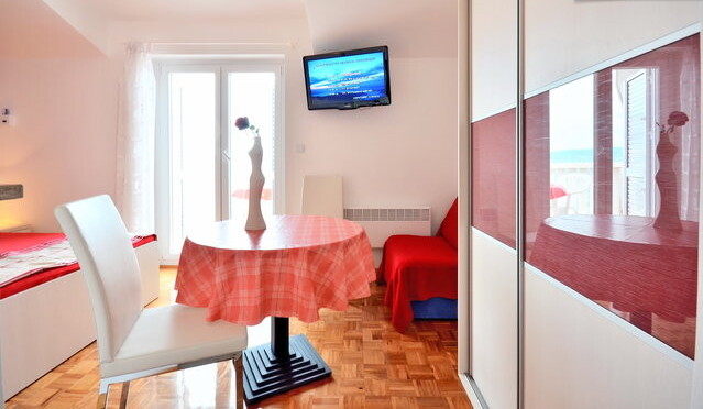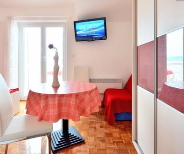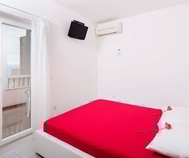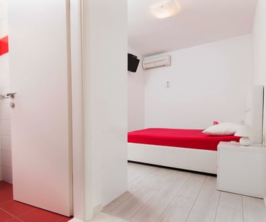 Bold crimson accents and crisp white walls set the stage for an unforgettable stay. Room KR1 is where passion meets the sea — step out onto your private terrace, let the Adriatic breeze wash over you, and let the only thing on your agenda be the sound of the waves.